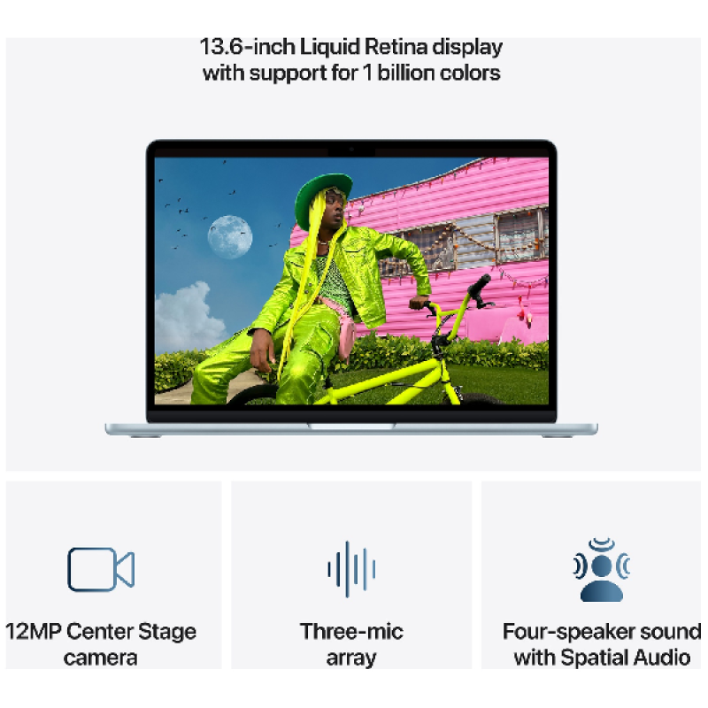 De MacBook Air is uitgerust met een 12-megapixel geïntegreerde webcam met Center Stage, waarmee je automatisch in het midden van het scherm blijft tijdens videogesprekken. Met Desk View kun je eenvoudig een bovenaanzicht van je werkplek delen wat ideaal is als je bijvoorbeeld online lesgeeft of je nieuwste project wilt tonen. Dankzij de 3 microfoons en 4 luidsprekers met ruimtelijke audio en Dolby Atmos geniet je van 3­-dimensionaal geluid als je naar muziek luistert of een film kijkt.