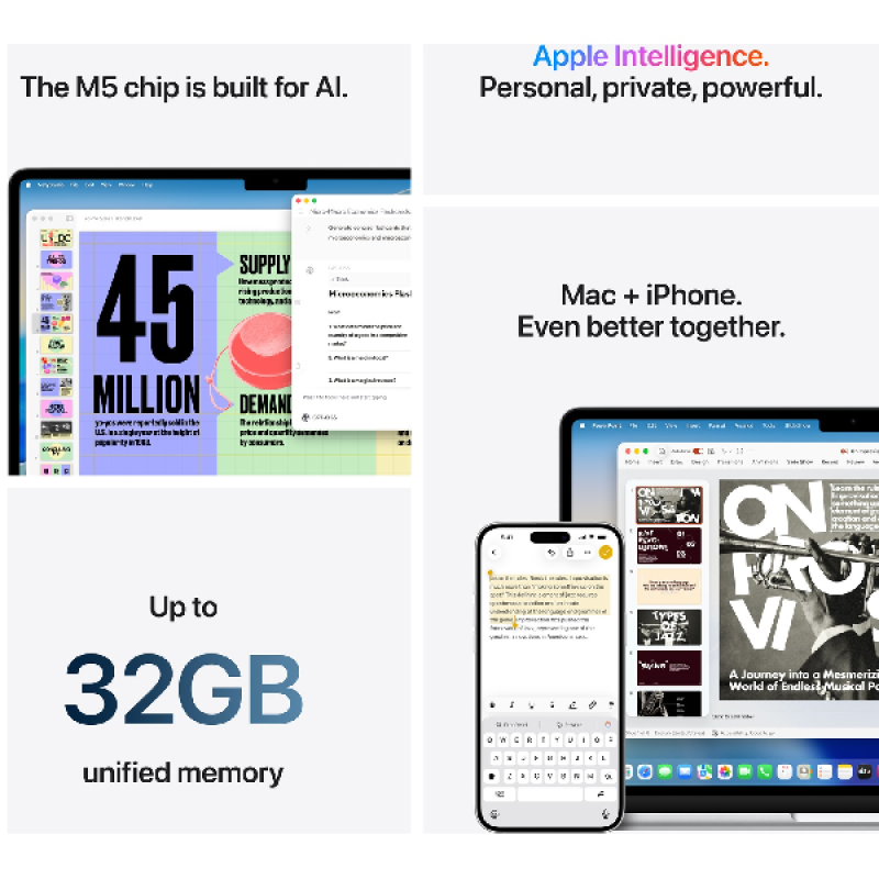 De CPU en het centraal geheugen van de M5-chip zijn nog sneller, waardoor alles wat je doet nog vloeiender gaat. Multitasken is makkelijker en je vliegt door je creatieve workflows heen. De snelle Neural Engine en de GPU van de nieuwste generatie met Neural Accelerators vormen een krachtig platform voor AI. Al je favoriete apps draaien razendsnel in macOS, waaronder ingebouwde apps als FaceTime en Berichten. Bovendien helpt Apple Intelligence je met schrijven, jezelf uitdrukken en dingen moeiteloos voor elkaar krijgen.
